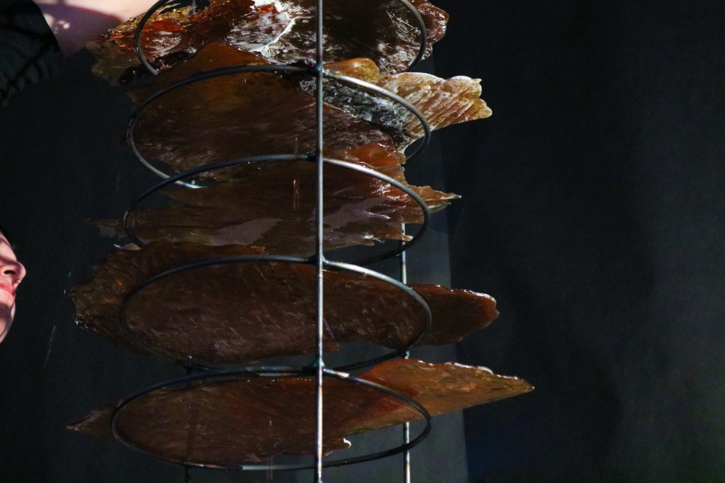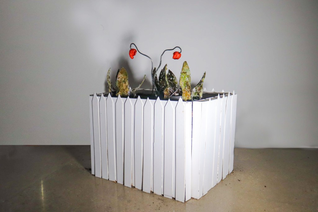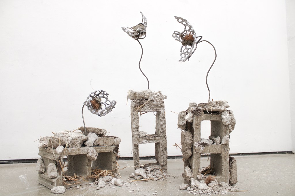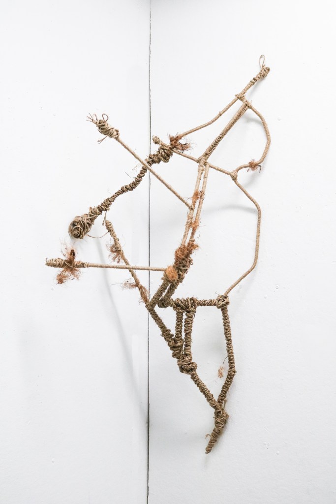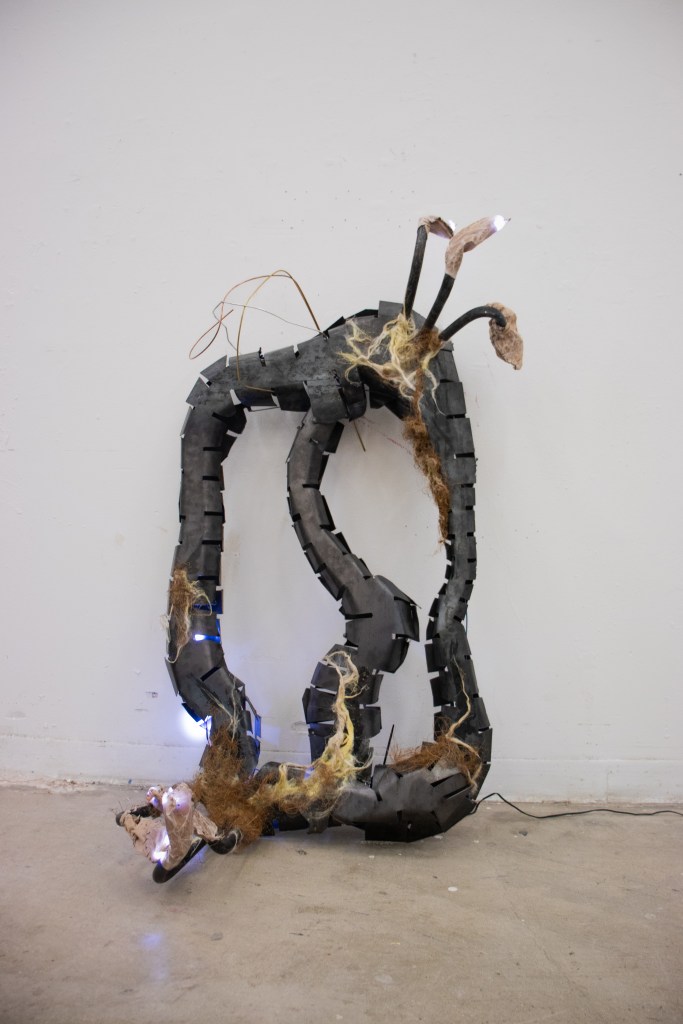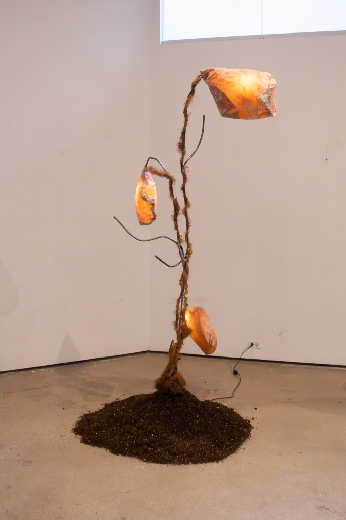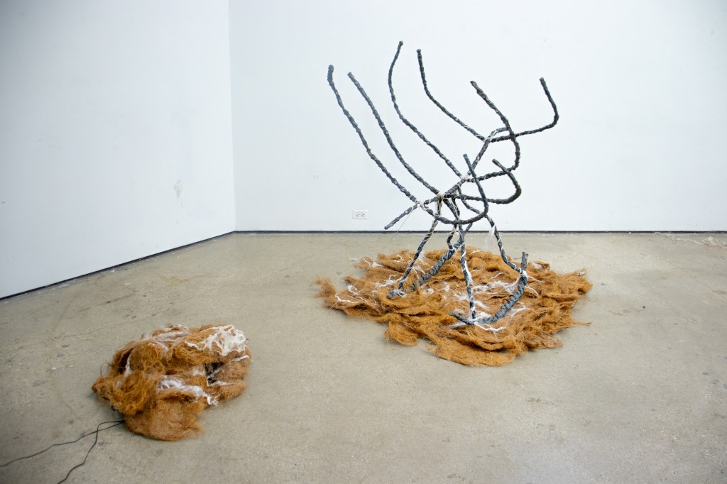 “Cradle” made out of metal, hemp, coconut fibers, linear actuator, and gel medium 7’ x 3.5’ x 4’“A Response Without Words” Durational Performance with Metal, Sugar, and Water “Intertwined ”, Metal, Coconut Fiber, and Rope 36” x 27” x 48” “A Little Light is Left “ Steel, coconut fiber, hemp, vibrating motors, and LEDs 3’ x 38” x 4.5’“Solidum Agere” Aluminum, Steel, Coconut fiber, Wasp Nest Paper, Straw, and Cement.“Vacare” Aluminum, Steel, and Potting Soil“Vita” Metal, soil, lights, LEDs, wax, fabric, cotton fiber, and a rotating motor“A Simple Life” Steel, MDF, Potting Soil, Cable, Aluminum, DC Motor, and Airplane Cable